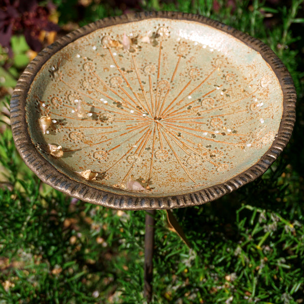 I craft each bird bath by hand, impressing hand carved textured stamps inspired by cow parsley umbels. Every piece is deliberately unique with subtle differences in pattern and glaze, so no two will ever be identical.