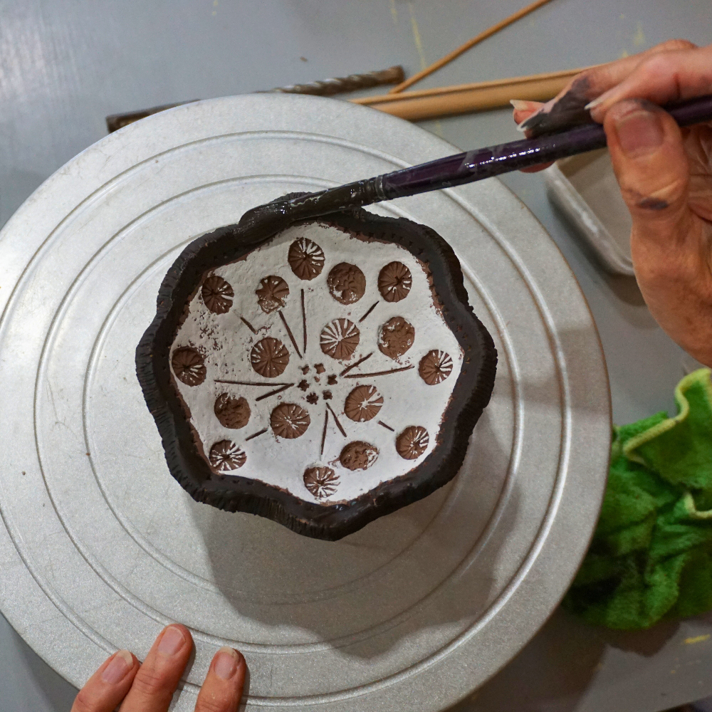 In the morning we will sculpt with clay to make seed heads and flowers (initially I will guide everyone step by step through the process of making a poppy seed head) and after lunch we will paint on the green and bronze glaze (this is called raw glazing).
