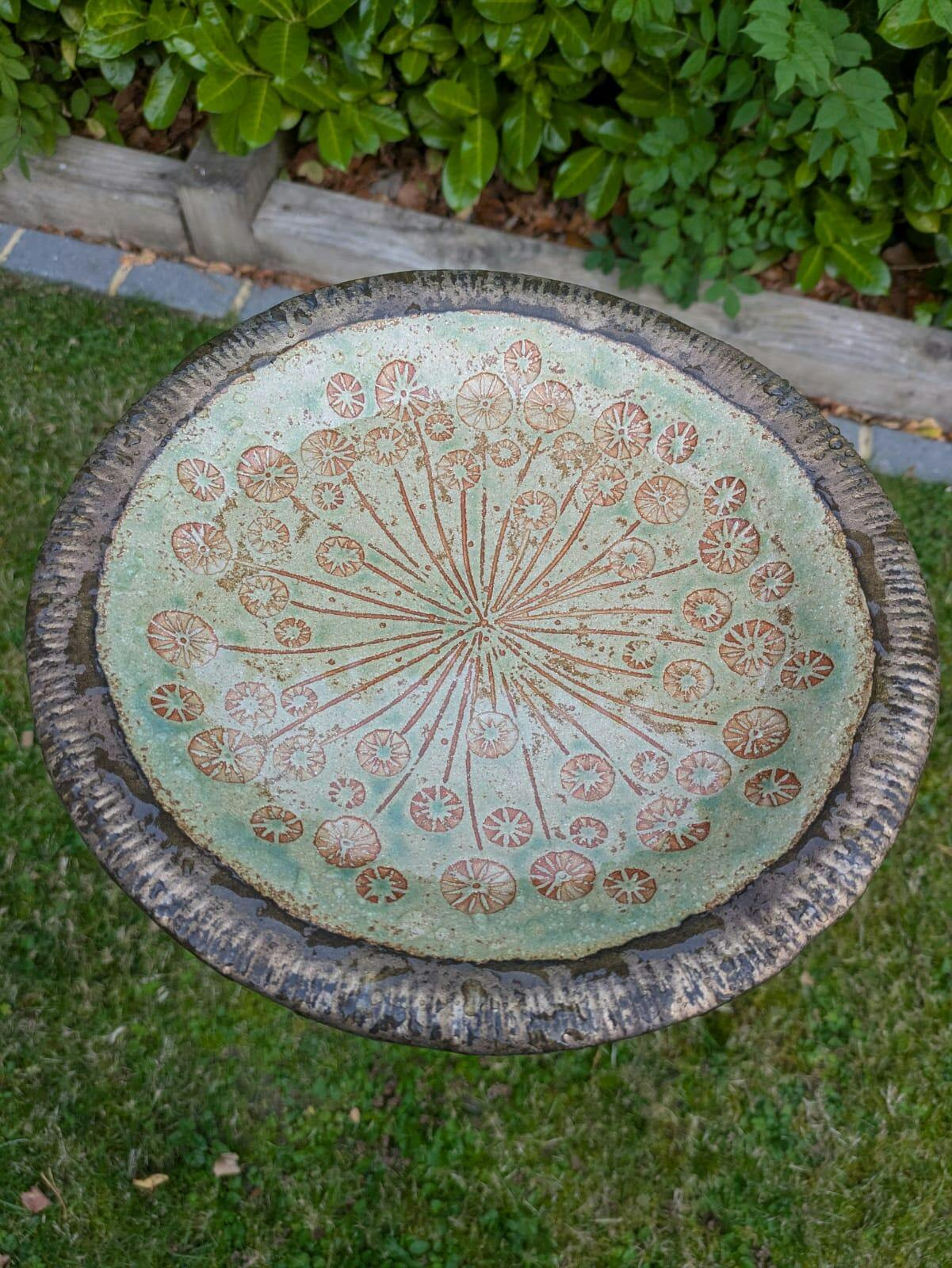 I craft each bird bath by hand, impressing hand carved textured stamps inspired by cow parsley umbels. Every piece is deliberately unique with subtle differences in pattern and glaze, so no two will ever be identical.