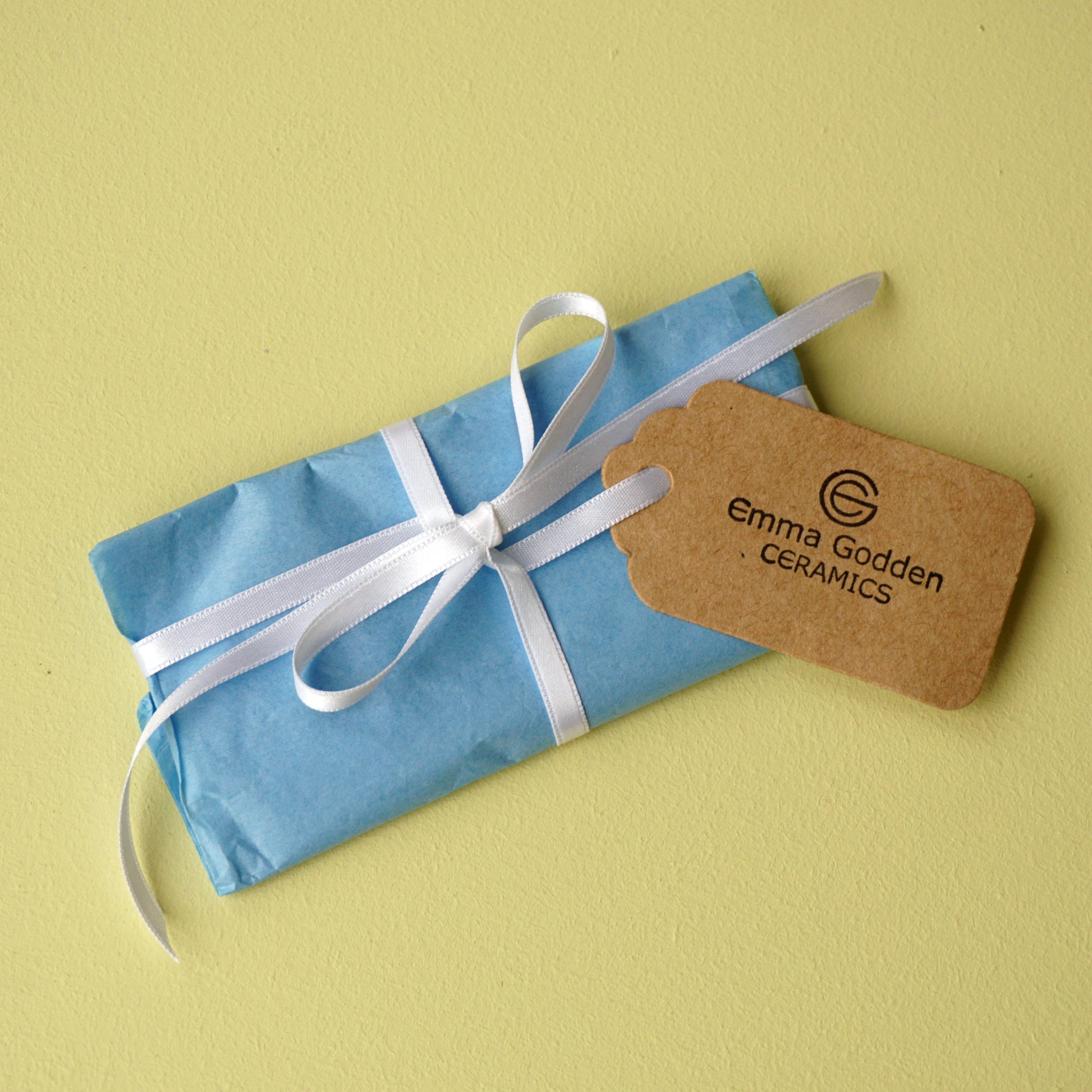 Once the clay has been rolled out, impressed and cut out, they need to firm up so I can smooth the edges, next they are dried slowly to avoid warping, biscuit fired, I apply the shiny glaze, and finally high-fired before threading on the organza ribbon. Each firing takes a day and a half, so it’s a slow making process!
